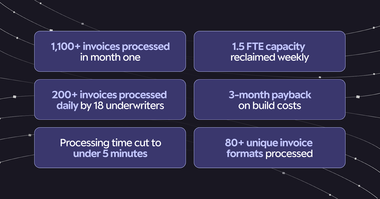 Once the solution was in our underwriters' hands, there was no taking it away. The tool landed at exactly the right moment—as our team was working to keep up with 30% volume growth without additional headcount. Our VP of Underwriting made it clear: she wasn't giving up the invoice extraction tool "over her dead body."