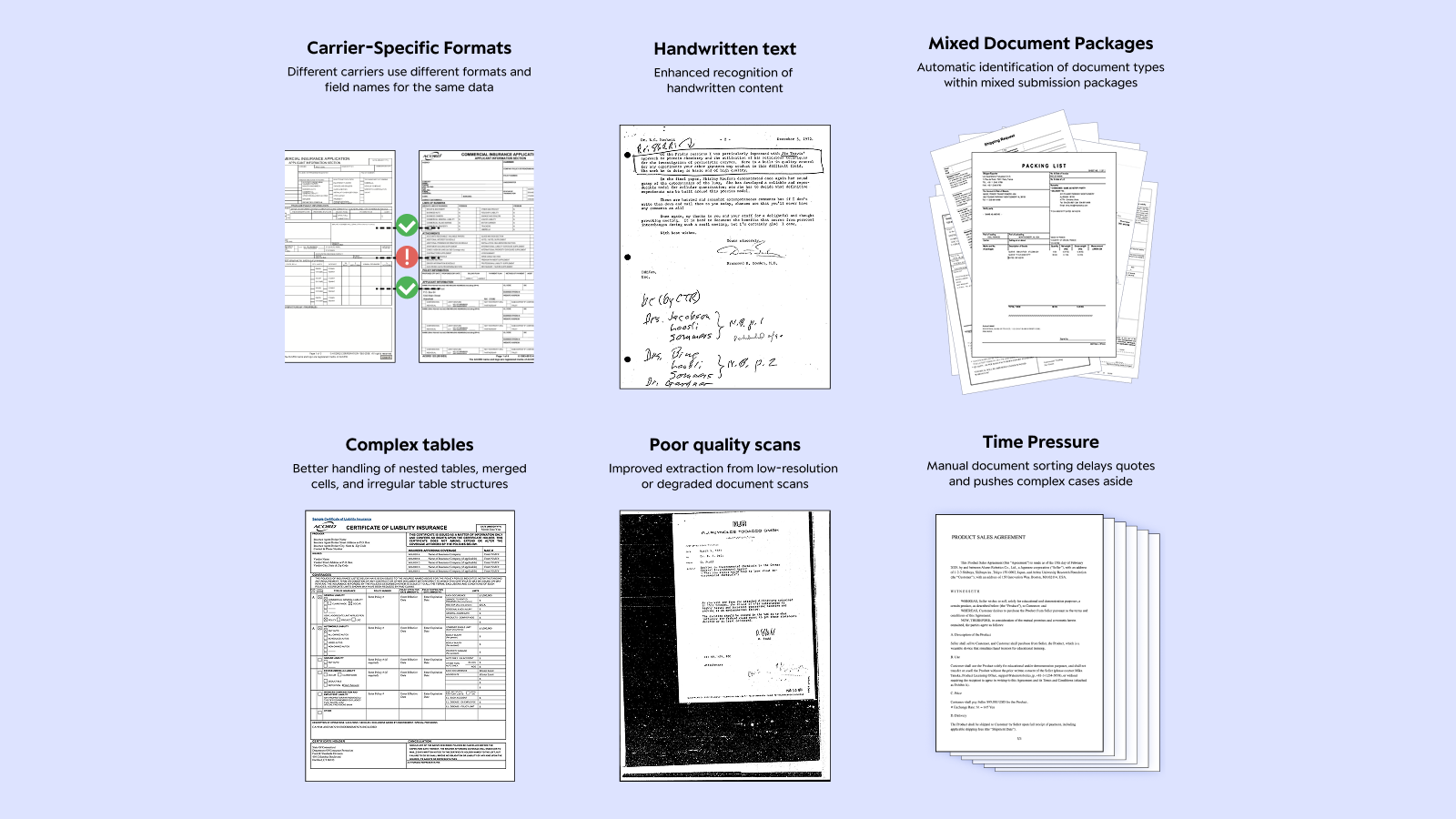 - 50-page mixed broker package → automatically sorted into "5 ACORD forms, 3 Loss Runs, 2 questionnaires"
