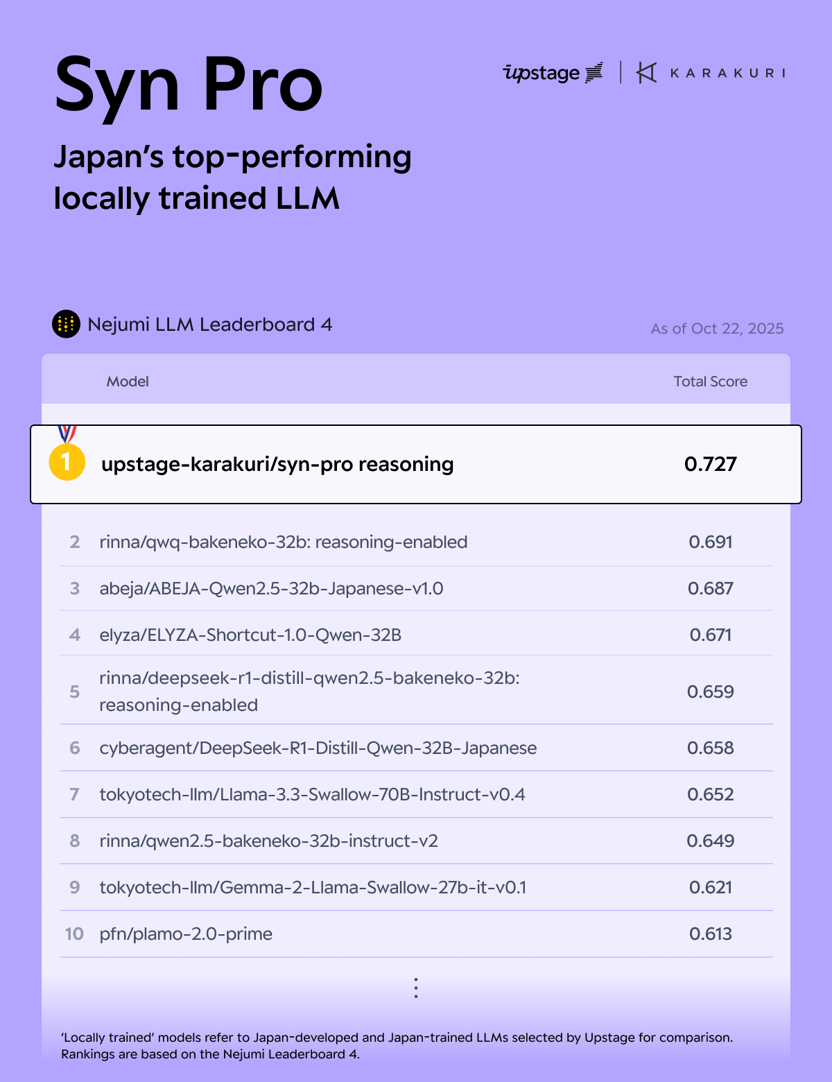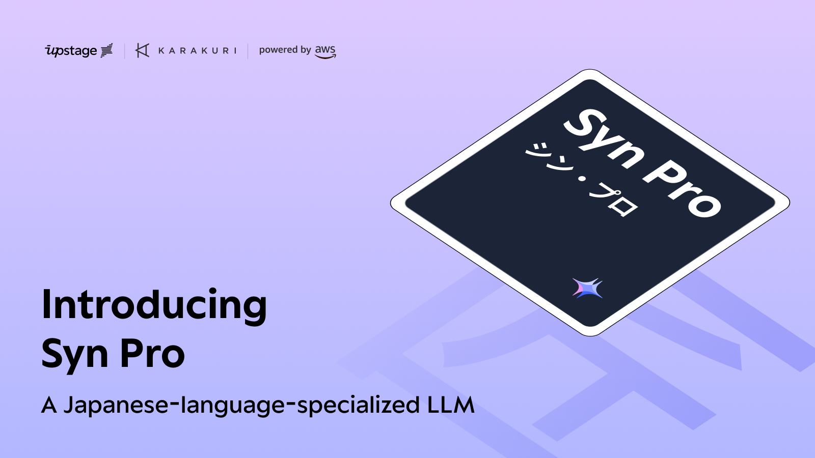 Upstage introduces Syn Pro—a major leap forward for Japan’s AI future with the release of Syn Pro, a next-generation Japanese Large Language Model (LLM) co-developed locally with Karakuri Inc., a leader in Japanese AI development.