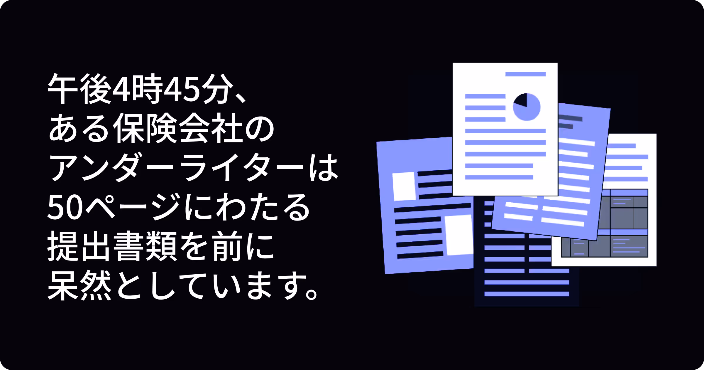 午後4時45分、ある保険会社のアンダーライターは50ページにわたる提出書類を前に呆然としています。半分の欄は空白、損害履歴のリストはぼやけたスキャンPDFです。しかし代理店は「見積りを出せば契約は確定する」と言います。アンダーライターはこの取引の確度が高いことを知っていますが、情報整理に数時間かかるため、今日中に処理するのは困難です。時間がない中で、優先順位の低い書類は永遠に埋もれてしまいます。