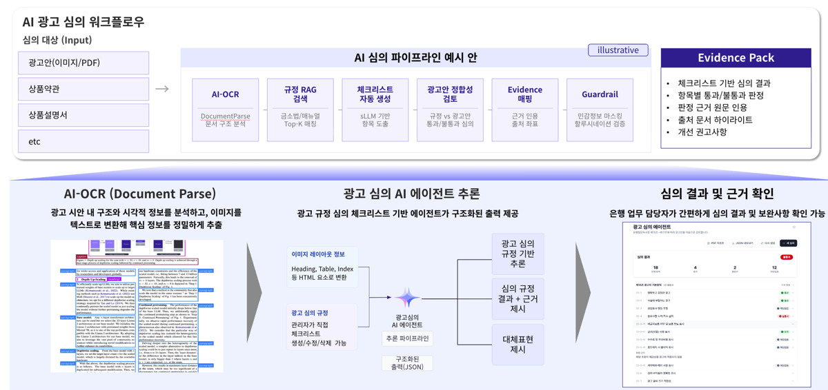 AI-OCR → 규정 RAG 검색 → 체크리스트 자동 생성 → 광고안 정합성 검토 → Evidence 매핑 → Guardrail