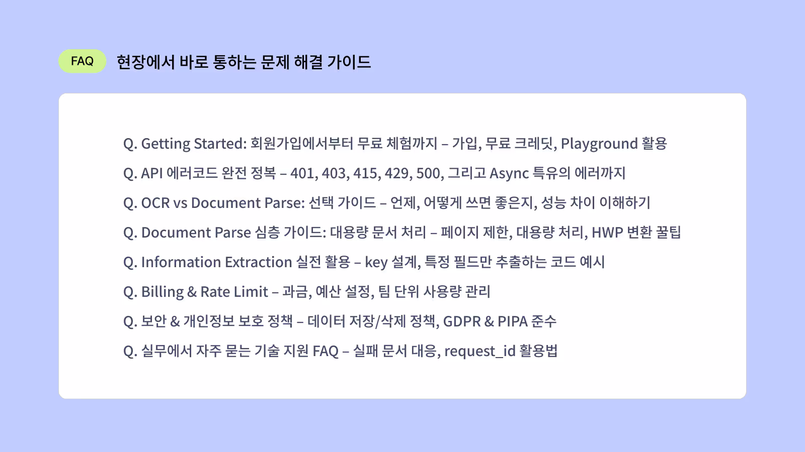 - 문서는 짧지만, 문제는 복잡합니다. API 사용 시 발생하는 에러, 기능 선택 기준, 과금 정책 등 문서만으로는 이해하기 어려운 내용을 실제 사례와 코드 예시로 풀어냅니다.