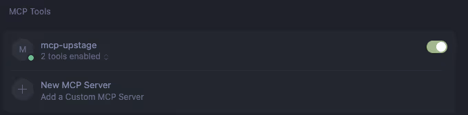 mcp-upstage가 running인지 확인해 주세요(jetbrains는 목록에 없으실 텐데, 정상이니 걱정하지 않으셔도 됩니다).