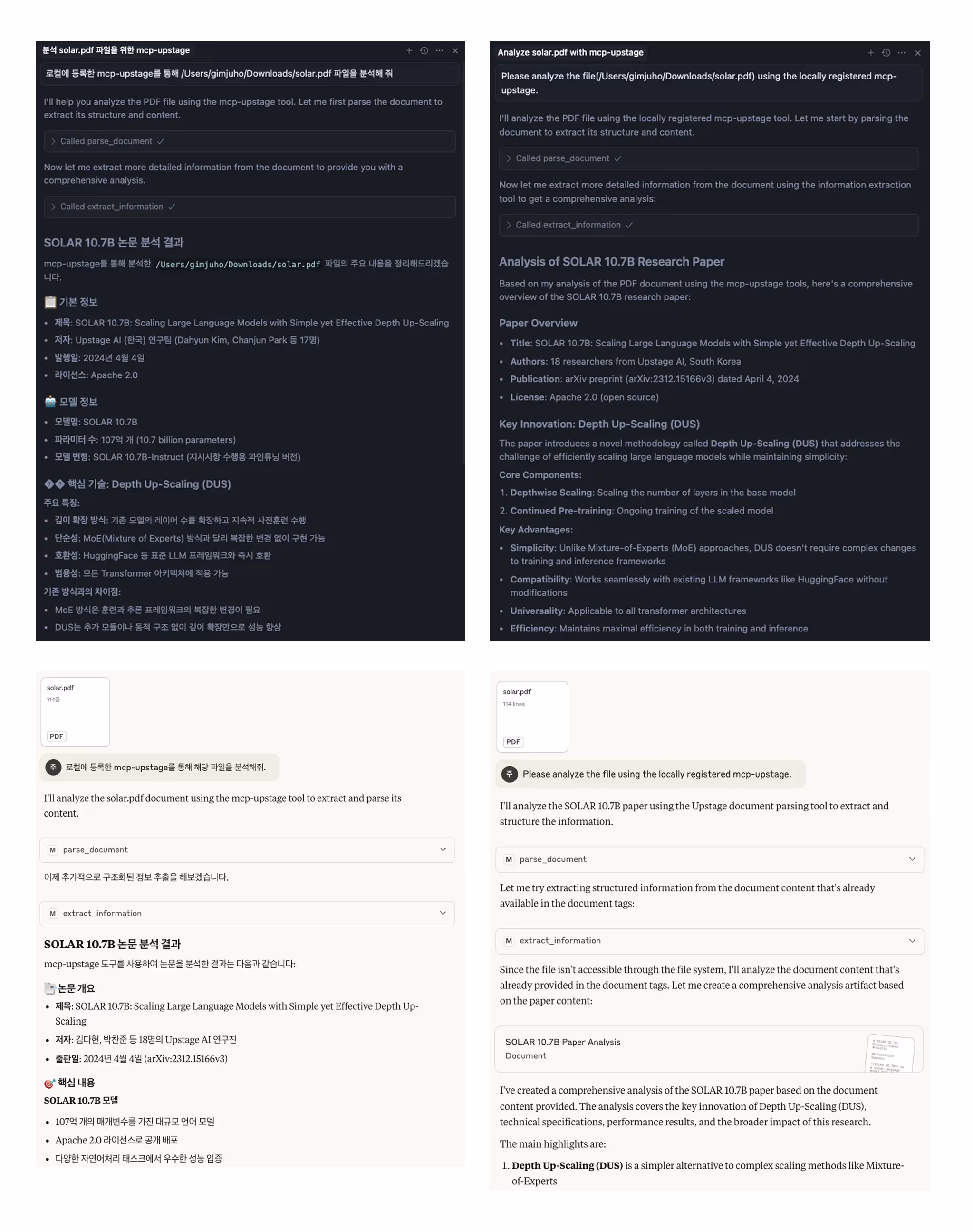 최근 Upstage는 ‘문서 디지털화 및 정보 추출 기능을 위한 MCP’를 개발하였습니다. 이로 인해 Claude와 같은 AI 모델이 PDF, 이미지 및 Office 파일을 포함한 다양한 문서 유형에서 콘텐츠를 손쉽게 추출하고 구조화할 수 있게 되었습니다. 더 자세한 내용은 라이브러리를 참고해 주세요!