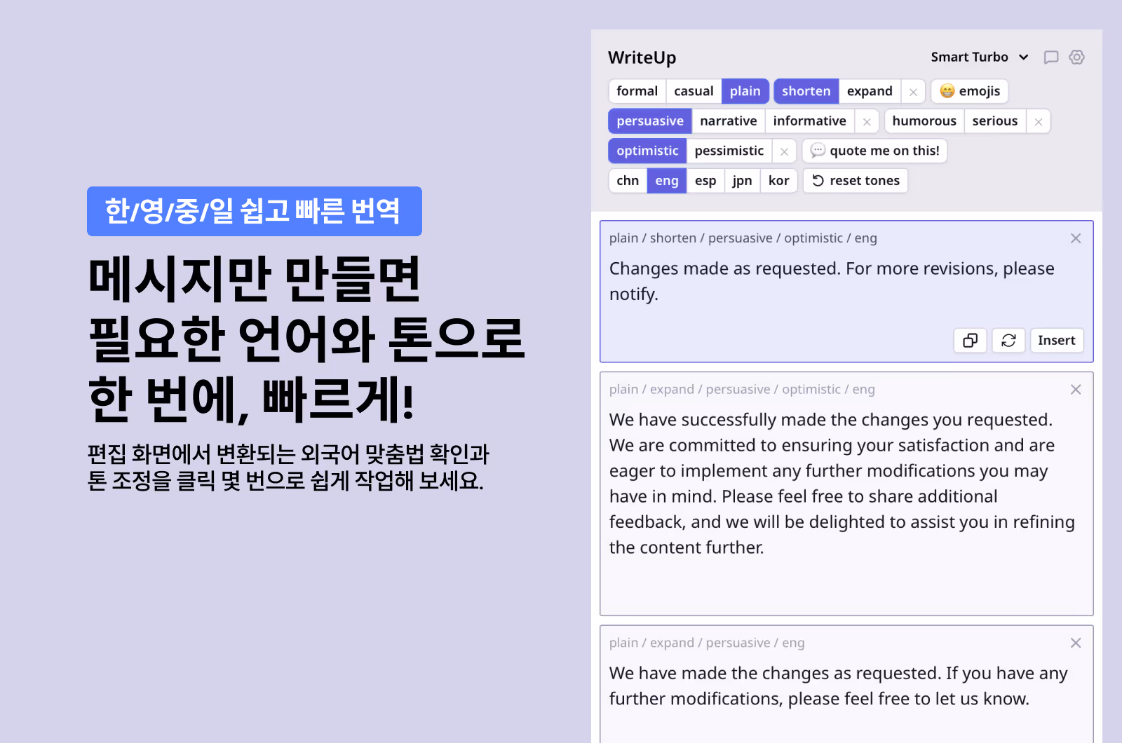 문장 수정 / 톤 조정 / 맞춤법 등 다양한 어조의 조합으로 원하는 어조를 만들어 사용해보세요!